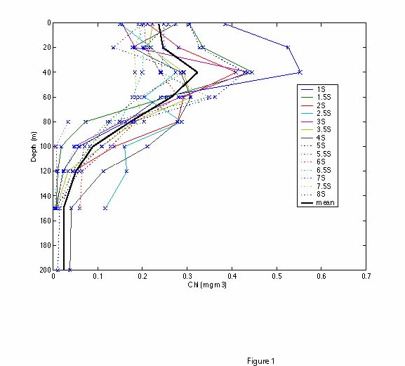 Figure 1. From Toby Westberry, UCSB. Chlorophyll profiles in the upper 200 m at the stations from 1°S to 8°S.