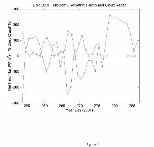 Figure 2. From Jeff Hare and Tanneil Uttal, ETL. Comparison of net heat flux (blue) with deep echo (red) from the ETL Cloud radar. Net Heat Flux includes sensible and latent turbulent heat fluxes and upwelling and downwelling solar and infrared radiant flux. Deep echo represents the number of hours per day (times 10) with radar echo depth (cloud + precip) exceeding 10km.