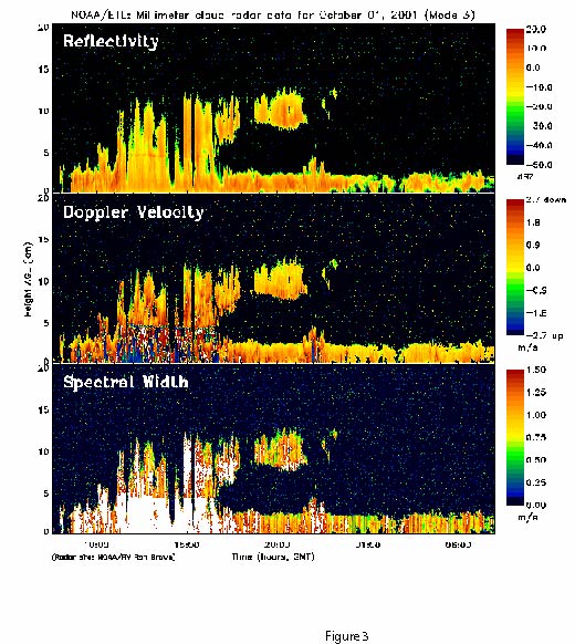 Figure 3. From Tanneil Uttal, ETL. Time-height cross-section of radar reflectivities, Doppler velocities and Doppler spectral widths showing deep clouds evolving to boundary layer marine stratus at 22:00 GMT on October 1st