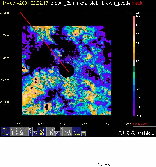 Figure 4. From Sandra Yuter, UW. Horizontal cross-section of C-band radar data from 02 UTC on 14 Oct 2001 showing drizzle cells in vicinity of ship. Red line is ship track. Grid marks are at 10 km intervals.