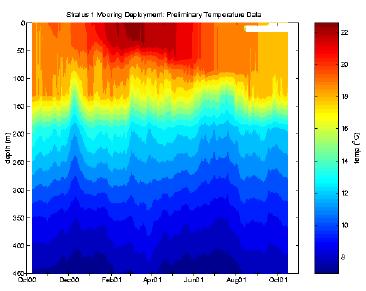 Figure 1 . Contour plot of upper ocean temperatures from the first year of the deployment of the WHOI IMET mooring u8nder the stratus. (R. Weller, WHOI).