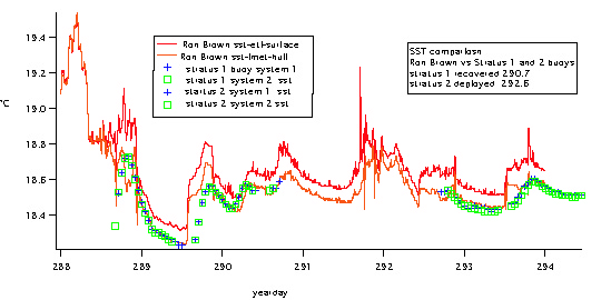 Figure 2 . Comparison of shipboard and buoy observations of SST done between the moored instruments of the first deployment (up to yearday 290.7) and of the second deployment (starting 292.6). (R. Weller, WHOI AND J. HARE, ETL).