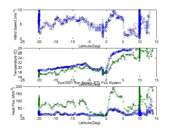 convective environment, with periods of deep clouds and variable radiative forcing. Leg II has been dominated by stratus clouds, dryer conditions (9 g/kg of water vapor and very little rain), and cooler air and sea temperatures (18 C and 19 C, respectively). Figure 3 shows a composite of mean wind, temperature, and turbulent heat fluxes, plotted with latitude. Notice the highly variable conditions encountered during Leg I (north of the Equator), and the much warmer air (green) and sea temperatures (blue) before entering the stratus region. Understanding the nature and quantifying the heat flux components within these distinct climatologies is an important goal of the Epic experiment. The combination of the flux data set with the cloud remote sensing systems data sets will be very effective in describing the radiative heat budgets for the two regimes. The next task for the flux group