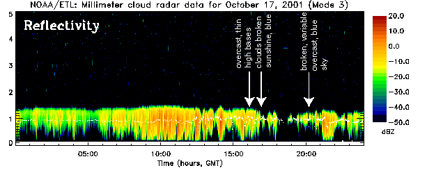 Figure 4 shows a 24-hr time-height cross section of the radar return from the stratus and the cloud base heights detected with the ceilometer (white line), as well as annotations of visual observations. Clouds are persistent through the day and with thinning between 16:00 and 24:00 GMT (afternoon and early evening local) indicating diurnal effects on cloud structure. Typically the radar return extends several 100s of meters below the cloud base indicating persistent virga and in some cases light drizzle that can be detected at the surface. The University of Washington (UW) group is measuring drop size distributions at the surface using blue methylene paper which will be useful for interpreting the radar-radiometer retrieved cloud microphysics, in particular for light drizzle. It has been noted that the persistent radar echo below cloud base, even when extending to the surface with reflectivities approaching 10 dBz are rarely associated with any detectable reduction in horizontal visibility.